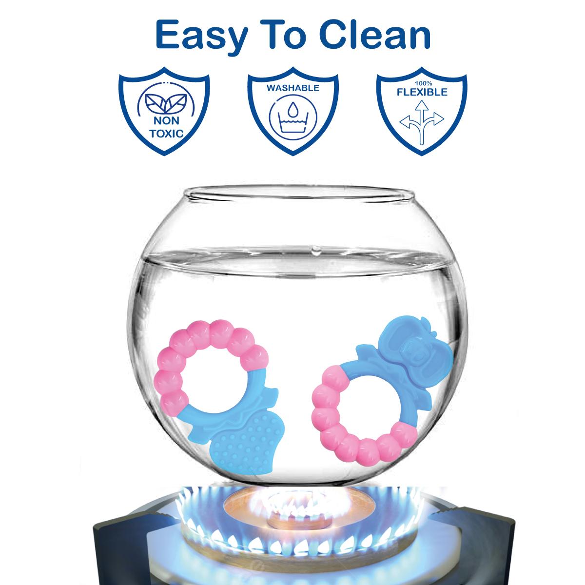 SOFT SILICONE MATERIAL –Our teether toys are made of soft and smooth silicone material, which is best for sore gums pain relief. It has grooves and bumps that gently rub a baby’s gums without harming the child’s mouth area.